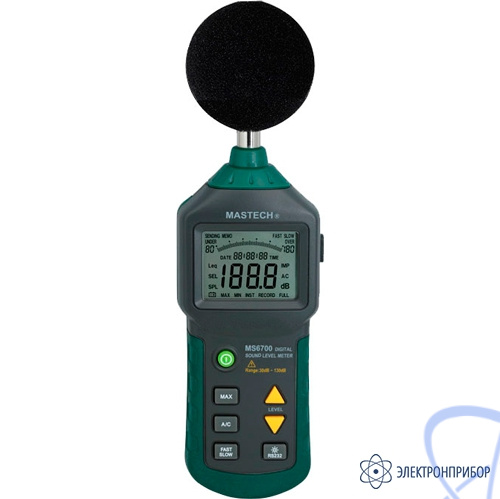 Цифровой шумомер MS6700 позволяет измерять уровень громкости звука и шумов в большом диапазоне и с высокой точностью. Прибор имеет специальный измерительный микрофон, обладающий очень малой неравномерностью АЧХ и высокой чувствительностью, усилитель, корректирующий фильтр и большой ЖК-дисплей для отображения полученных результатов измерения. Помимо цифровой индикации результатов измерения в шумомере MS6700 предусмотрена графическая шкала для мнемонического отображения величин. Прибор можно подключать к персональному компьютеру с помощью последовательного порта RS-232 для последующей обработки полученных данных. В условиях недостаточной видимости подсветка дисплея поможет прочитать полученные данные. Питание прибора осуществляется с помощью батареи питания 9 В типа "Крона" или внешнего адаптера питания 9 В. Цифровой измеритель уровня громкости MS6700 имеет сертификат РосТеста.