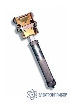 Для опоры на трубу и фиксации постоянного угла отслаивания приблиз. 180 град. корпус на ролики (4), одну пару из которых можно передвигать и фиксировать в гнездах (5-9) в зависимости от черт. 1 диаметра трубы. К корпусу прикреплен силоизмеритель с двумя последовательно расположенными пружинами (10), левая шкала — положение фиксатора (11) №1, правая шкала — положение фиксатора (11) №2.