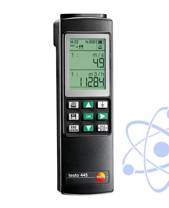 Testo 445 – 2-х канальный многофункциональный измерительный прибор преназначен для измерений температуры (термопары Тип K/J/S/NTC), относительной влажности, температуры точки росы, скорости потока, абсолютной влажности, степени влажности, энтальпии, давления, концентрации CO2 и CO.