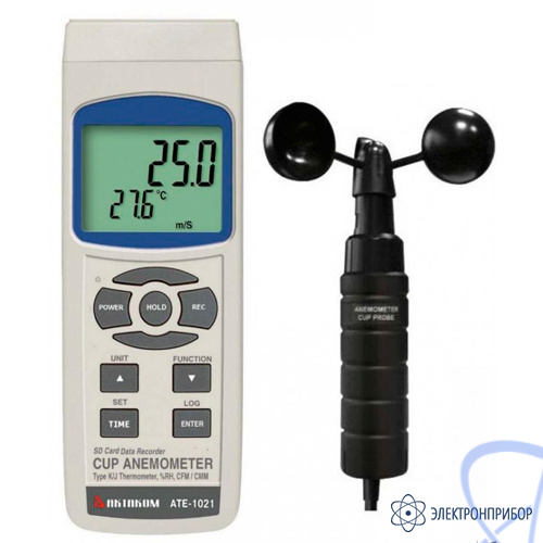 Портативный анемометр АТЕ-1021 имеет микропроцессорное управление и предназначен для измерения скорости и температуры ветра на открытых пространствах, а также на строительных сооружениях, кранах. Использование прибора на открытой местности стало возможным благодаря применению датчика чашечного типа, что обеспечивает измерения даже при больших скоростях воздушного потока (до 35 м/с) независимо от направления движения воздушного потока. АТЕ-1021 может подключаться к компьютеру, а, кроме того, имеется возможность сохранения измеренных данных на карту SD в формате Excel в режиме реального времени без использования специального программного обеспечения.