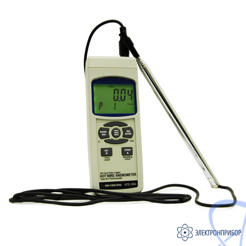Портативный анемометр АТЕ-1034 является удобным инструментом для измерения параметров воздушного потока как на вентиляционных решетках, так и непосредственно в воздуховодах. Анемометр АТЕ-1034 работает по принципу охлаждения воздушным потоком нагретой нити. Одной из особенностей анемометра АТЕ-1034 является выносной датчик — миниатюрный стеклянный термистор, который размещается в малогабаритной измерительной головке диаметром 12 мм на телескопической ручке, благодаря чему его можно использовать для измерений в труднодоступных местах. Помимо скорости воздушного потока, анемометр АТЕ-1034 позволяет измерять температуру.