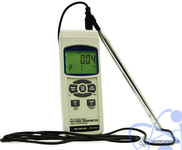 Портативный анемометр АТЕ-1034 является удобным инструментом для измерения параметров воздушного потока как на вентиляционных решетках, так и непосредственно в воздуховодах. Анемометр АТЕ-1034 работает по принципу охлаждения воздушным потоком нагретой нити. Одной из особенностей анемометра АТЕ-1034 является выносной датчик — миниатюрный стеклянный термистор, который размещается в малогабаритной измерительной головке диаметром 12 мм на телескопической ручке, благодаря чему его можно использовать для измерений в труднодоступных местах. Помимо скорости воздушного потока, анемометр АТЕ-1034 позволяет измерять температуру.