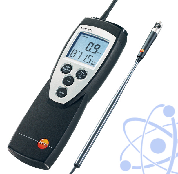 testo 416, компактный анемометр с крыльчаткой, со стационарно закрепленным телескопическим (макс. 890 мм) зондом-крыльчаткой D=16 мм, с батарейкой и заводским протоколом калибровки.