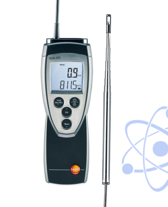 Компактный термоанемометр testo 425 со стационарно подсоединенным обогреваемым зондом температуры/скорости воздуха и телескопической рукояткой. Значение объемного расхода отображается непосредственно на дисплее. Точный расчет объемного расхода благодаря тому, что зонд легко помещается в воздуховод. Также возможно переключение на отображение показаний текущей температуры. Функция усреднения по времени и количеству замеров, позволяет получить усредненные значения объемного расхода, скорости потока и температуры. Мин/макс значения можно также отобразить на дисплее. Функция Hold позволяет зафиксировать текущие данные измерений на дисплее.