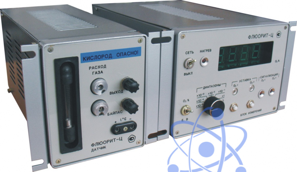 ФЛЮОРИТ-Ц (в стандартном корпусе) предназначен для измерений объёмной доли кислорода в инертных газах и азоте и представляет собой цифровой промышленный, стационарный прибор непрерывного действия. Принцип действия газоанализатора основан на применении потенциометрической твёрдоэлектролитной ячейки.