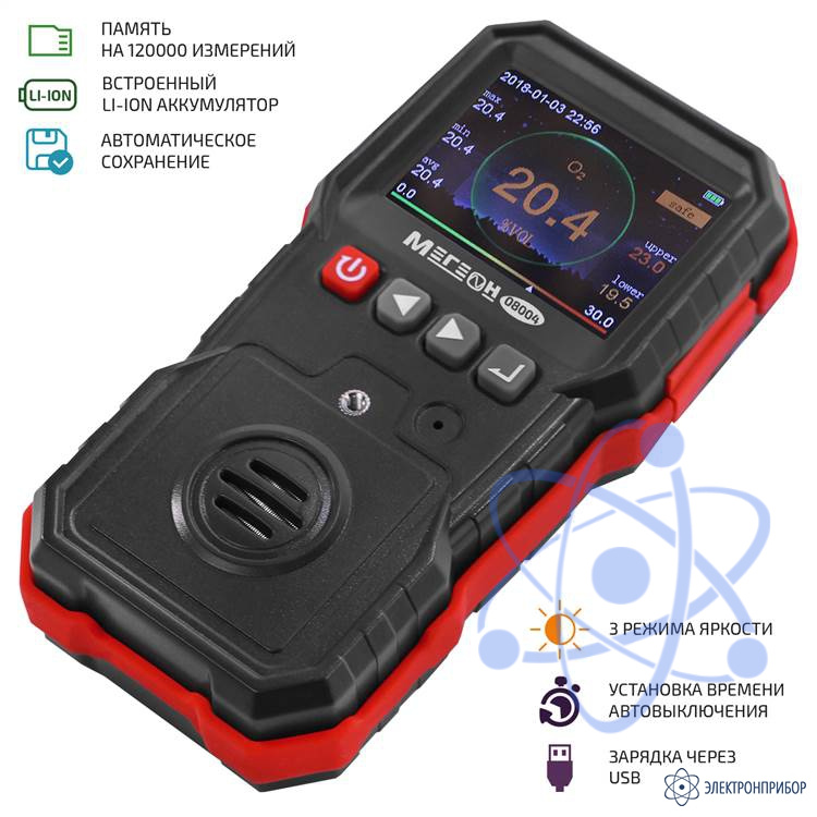 Все процессы отображаются на ярком цветном ЖК-дисплее. Данные могут быть записаны в память, которая позволяет сохранить до 120000 измерений. При этом обеспечивается удержание максимальных, минимальных и средних значений в автоматическом режиме. Три вида настраиваемой сигнализации включают в себя звуковое сопровождение, световую индикацию и вибрацию, которые осуществляют информирование при достижении концентрации одного из пределов тревоги. Одним из значимых преимуществ является возможность калибровки тремя методами по двум точкам.