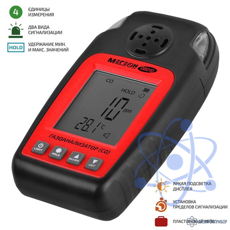 МЕГЕОН 08010 - новинка в модельном ряду измерителей концентрации угарного газа в воздухе, бытовых и промышленных зданиях и сооружениях. Газоанализатор имеет современный эргономичный корпус, компактные размеры и небольшой вес. Все изменения отображаются на ЖК- дисплее с яркой светодиодной подсветкой, которая позволяет использовать анализатор в условиях недостаточной видимости и в тёмное время суток. Дополнительно обеспечивается вычисление максимальных и минимальных значений. Два вида сигнализации включают в себя звуковое сопровождение и световую индикацию, которые осуществляют информирование при достижении концентрации одного из пределов тревоги.