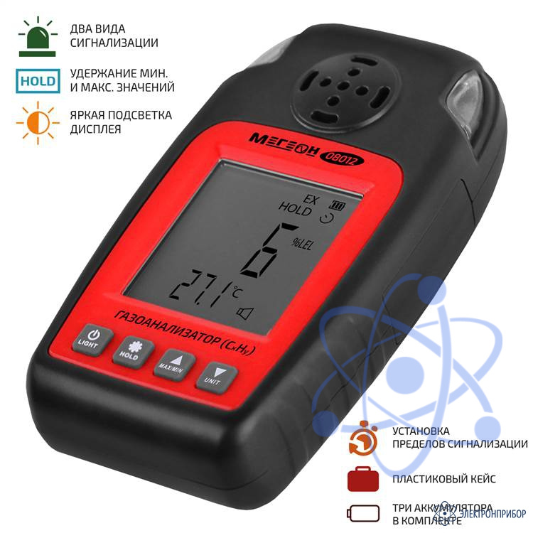 МЕГЕОН 08012 - новинка в модельном ряду измерителей концентрации горючих газов в воздухе, бытовых и промышленных зданиях и сооружениях. Газоанализатор имеет современный эргономичный корпус, компактные размеры и небольшой вес. Все изменения отображаются на ЖК- дисплее с яркой светодиодной подсветкой, которая позволяет использовать анализатор в условиях недостаточной видимости и в тёмное время суток. Дополнительно обеспечивается вычисление максимальных и минимальных значений.