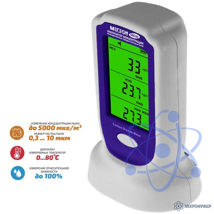 МЕГЕОН 08030 - цифровой анализатор мелкодисперсных твёрдых частиц. Предназначен для стационарной установки в местах, где необходим контроль концентрации пыли. В дополнение осуществляет измерения температуры и относительной влажности. Прибор прекрасно подойдёт для размещения в кабинетах, помещениях и производственных площадках. Идеально подходит для применения в цехах абразивно- струйной очистки материалов или жилищах рядом с транспортными магистралями. Измеритель выгодно отличается способностью работать с частичками размером 0,3 ... 10 мкм, обширным набором контролируемых параметров, крупным контрастным дисплеем с подсветкой зелёного цвета.