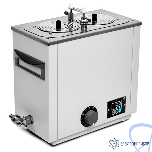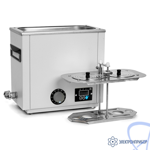 - Система из 5‑ти стальных концентрических колец позволяет уплотнять размещенные в ванне колбы, стаканы и другую лабораторную посуду.