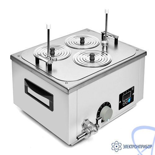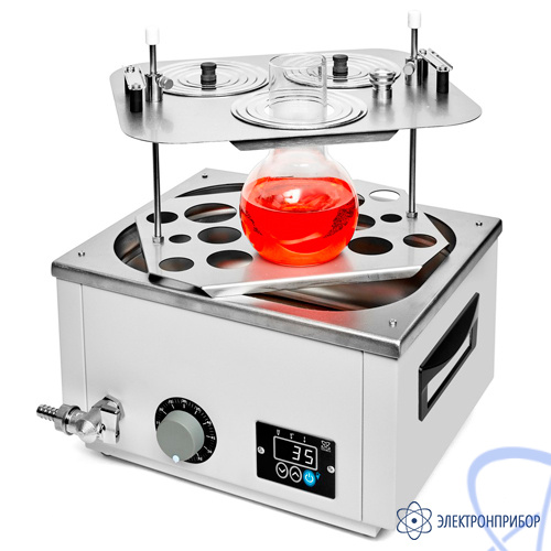 - Система из 5‑ти стальных концентрических колец позволяет уплотнять размещенные в ванне колбы, стаканы и другую лабораторную посуду.