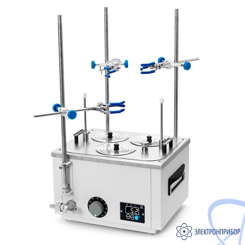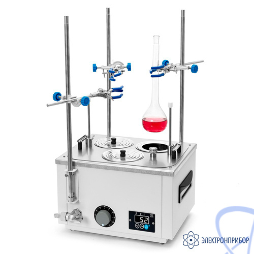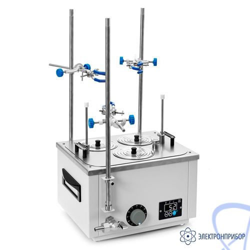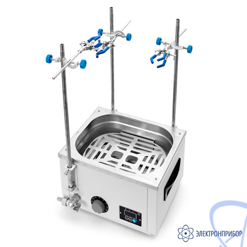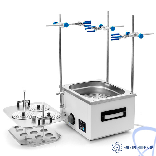 Универсальная баня ЛБ31‑Ш оснащена легко извлекаемой корзиной с подвижным дном для размещения лабораторной посуды различного размера, стальными концентрическими кольцами для ее уплотнения, штативами и лапками с зажимом.