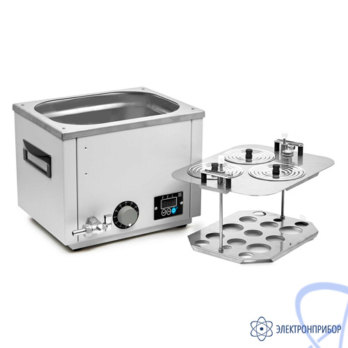 - Система из 5‑ти стальных концентрических колец позволяет уплотнять размещенные в ванне колбы, стаканы и другую лабораторную посуду.