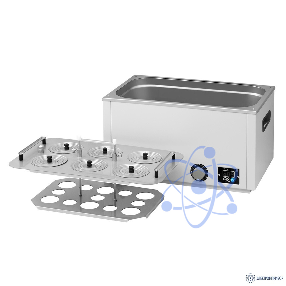 - Система из 5‑ти стальных концентрических колец позволяет уплотнять размещенные в ванне колбы, стаканы и другую лабораторную посуду.