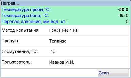ПТФ-20 оснащен уникальной системой охлаждения бани, которая позволяет достичь нижнего предела температуры -80°С без использования дополнительного оборудования. Во время испытания на дисплей выводятся текущие условия испытания, показания датчика температуры бани, датчика температуры пробы, перепад давления.