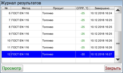 Ведение журнала испытаний обеспечивает хранение до 1024 результатов испытаний: метод испытания, наименование продукта, предельная температура фильтруемости, время окончания испытания, имя пользователя.
