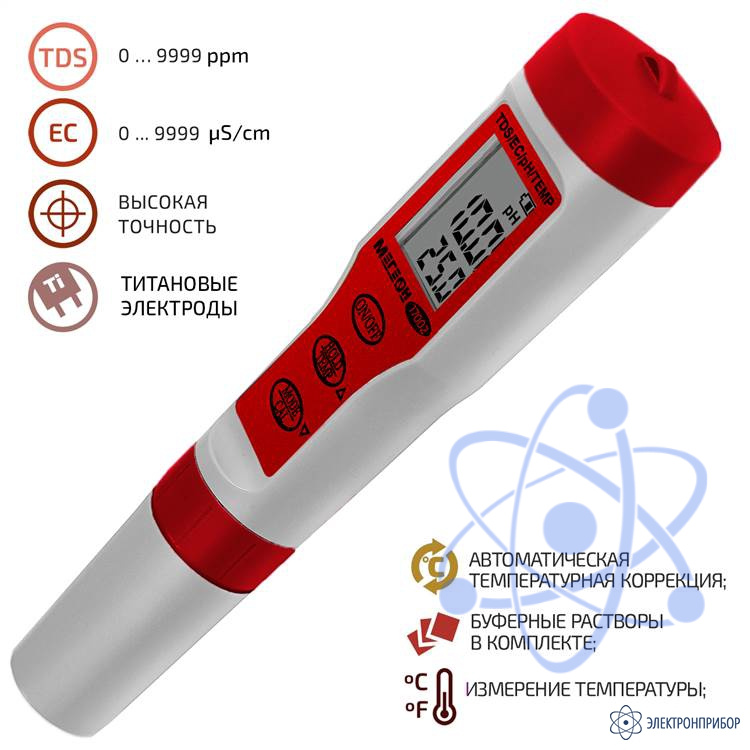 Корпус изготовлен из качественного пластика и получил компактные размеры. Функция автоматической компенсации температуры, а также возможность удерживать полученные результаты на дисплее делают эксплуатацию простой и удобной. Изделие имеет широкий спектр применения и будет необходимо для проверки воды в бассейне и аквариуме, в лабораториях и медицинских учреждениях, при организации гидропоники и тепличного выращивания, на производстве и пищевой промышленности. Будет незаменимым помощником у профессионалов и любителей.