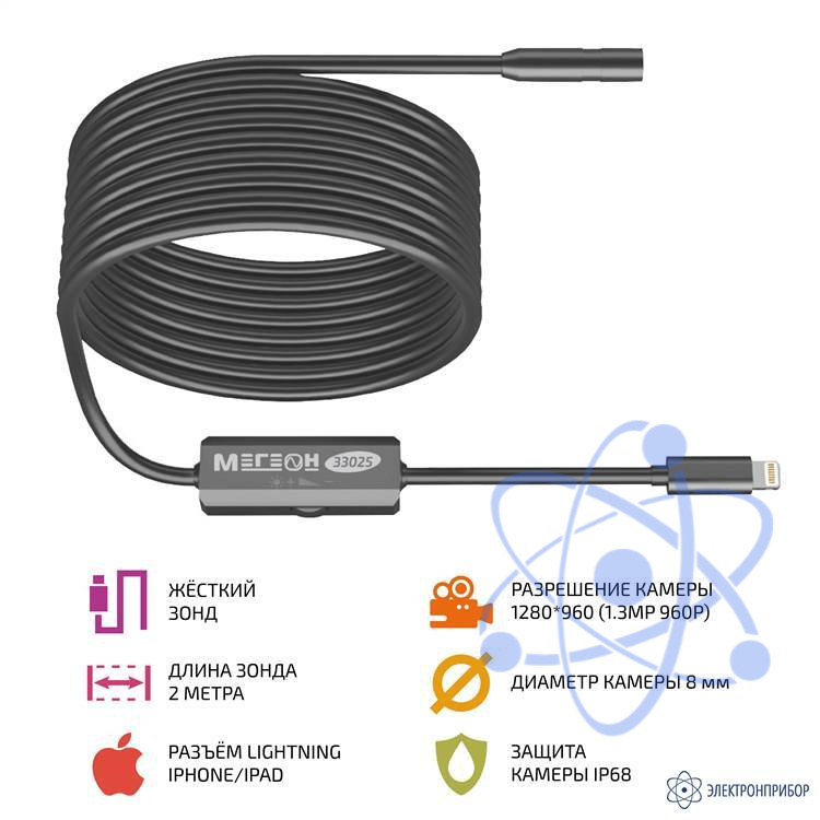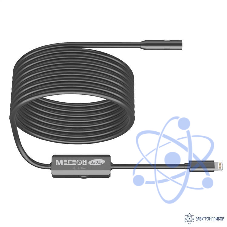 МЕГЕОН 33025 – это многофункциональный видеоскоп с камерой диаметром 8 миллиметров, жёстким зондом длиной 2 метра, оснащён Lightning разъёмом, позволяющим подключать его к устройствам Apple iPhone и iPad. Видеокамера высокой чёткости с защитой (IP68), со встроенной регулируемой светодиодной подсветкой позволяет работать даже в плохоосвещенных местах. Устройство не требует источника питания, так как подключается к Lightning разъёму устройства и питается от него. Идеально подойдет для проведения визуального осмотра скрытых полостей, труднодоступных областей, внутренних частей различного оборудования без повреждения и предварительного демонтажа других элементов. Длина измерительного зонда позволяет производить визуальную ревизию систем вентиляции и трубопровода. В комплекте поставки: съёмное зеркало (перископ) для обзора по бокам, магнитный держатель и крючок для возможности извлечь упавшую деталь. В используемом ПО возможна видео- и фотофиксация изображения. Прибор найдёт широчайшее применение там, где в труднодоступных местах нужно увидеть без дополнительной разборки.