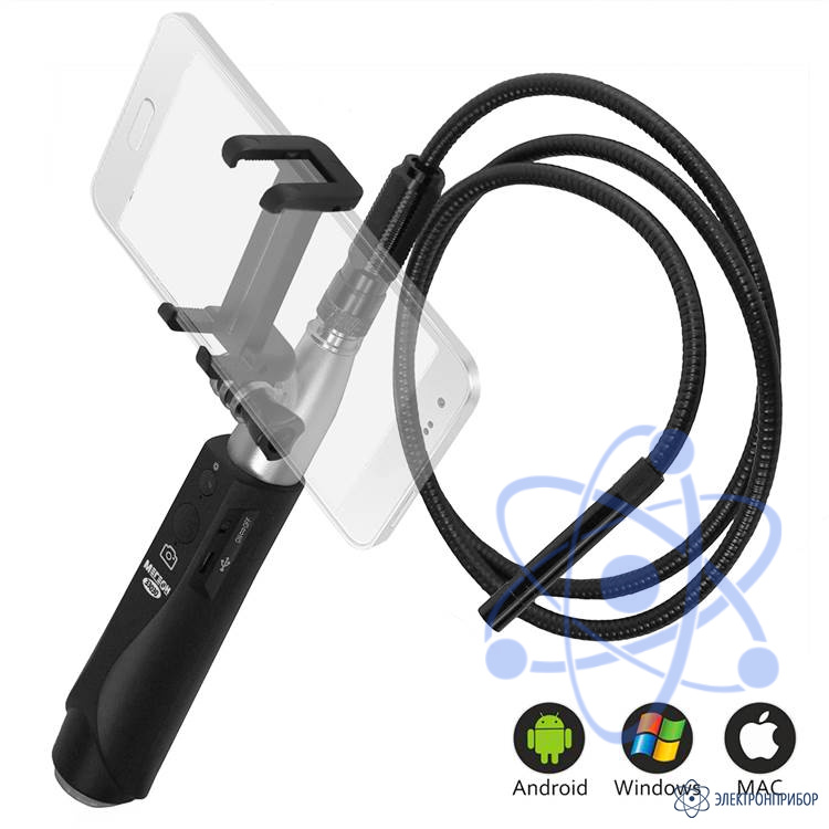 МЕГЕОН 33030 - представляет собой видеоскоп в виде рукоятки эргономичной формы, на которою с помощью держателя устанавливается мобильное устройство связи и полужёсткого зонда. Передача изображения от камеры на монитор осуществляется OTG - кабелем. Подсветка пространства перед объективом обеспечивается шестью светодиодами высокой интенсивности. Благодаря переносу и сохранению информации в память гаджета iOS или Android достигается максимальное удобство, так как позволяет переслать полученные файлы по электронной почте, мессенджерами или социальными сетями.