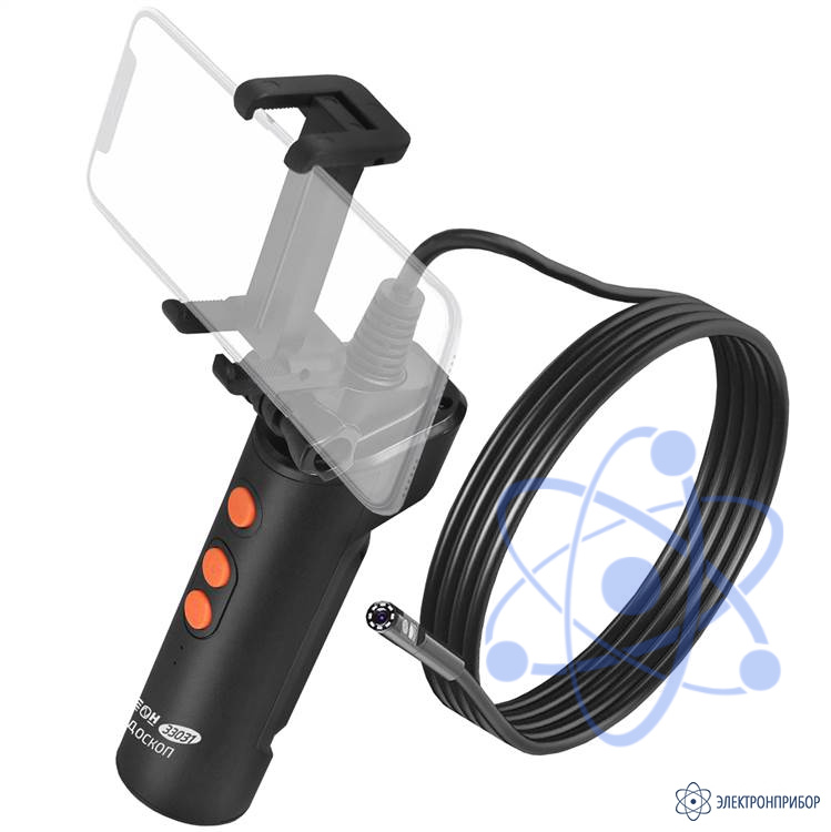 Конструкция захвата позволяет свободно удерживать гаджет шириной до 73 мм, но это не мешает держать более габаритный аппарат в руках, так как передачу данный обеспечивает дистанционная связь. Видеонаблюдение осуществляется с двух пыле- влагозащищённых камер- фронтальной и боковой. Яркая светодиодная подсветка высокой интенсивности гарантирует прекрасную видимость в полном отсутствии освещения. Полужёсткой зонд встроен в рукоятку и не имеет разъёмного соединения.