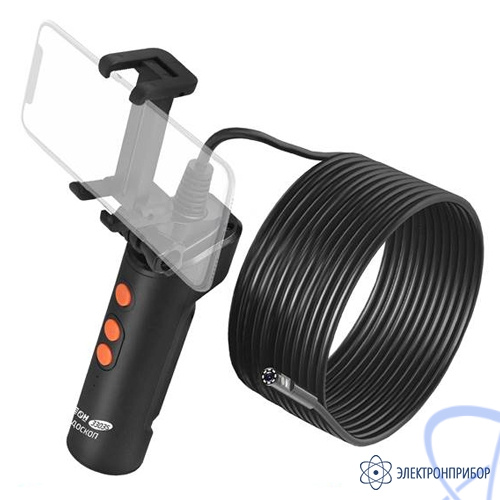 МЕГЕОН 33035 - видеоскоп- эндоскоп с подключением через Wi-Fi. Прибор удобен своей возможностью работать с большим количеством мобильных устройств. Теперь размер изображения зависит только от диагонали экрана личного смартфона или планшета. Программное обеспечение позволяет работать с операционными системами на базе Android и IOS. Необходимое приложение доступно скачивания без ограничения в Play Market и APP Store. Конструкция захвата позволяет свободно удерживать гаджет шириной до 73 мм, но это не мешает держать более габаритный аппарат в руках, так как передачу данный обеспечивает дистанционная связь. Видеонаблюдение осуществляется с двух пыле- влагозащищённых камер- фронтальной и боковой. Яркая светодиодная подсветка высокой интенсивности гарантирует прекрасную видимость в полном отсутствии освещения. Полужёсткой зонд встроен в рукоятку и не имеет разъёмного соединения.