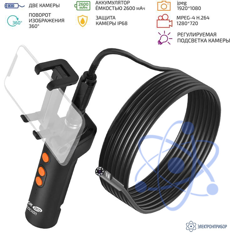 МЕГЕОН 33073 - видеоскоп- эндоскоп с подключением через Wi-Fi. Прибор удобен своей возможностью работать с большим количеством мобильных устройств. Теперь размер изображения зависит только от диагонали экрана личного смартфона или планшета. Программное обеспечение позволяет работать с операционными системами на базе Android и IOS. Необходимое приложение доступно скачивания без ограничения в Play Market и APP Store. Конструкция захвата позволяет свободно удерживать гаджет шириной до 73 мм, но это не мешает держать более габаритный аппарат в руках, так как передачу данный обеспечивает дистанционная связь.