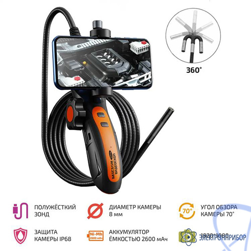 МЕГЕОН 33074 – это Wi-Fi видеоскоп с регулируемым в диапазоне 360 градусов углом положения камеры, оснащенной светодиодной подсветкой. Прибор подключается к мобильному телефону посредством беспроводного подключения. Специальное программное обеспечение «Wifi Check» позволяет управлять устройством, устанавливать нужные параметры, а также сохранять на карту памяти смартфона отснятые фото и видео материалы для последующего анализа. Все модели линейки укомплектованы дополнительными насадками - съёмным зеркалом (перископ), магнитным держателем и крючком. Удобный и простой в использовании, он может применяться на производстве и в быту для визуального осмотра в пространствах, доступ к которым затруднён - в скрытых полостях зданий и сооружений, в системах канализации и вентиляции, внутри корпусов оборудования и др.