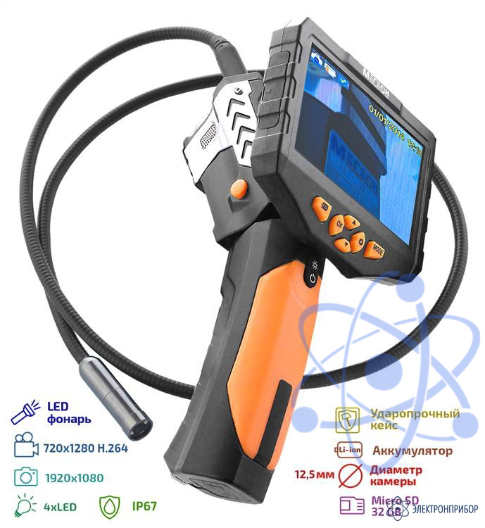 МЕГЕОН 33500-1125 - новинка в модельном ряду цифровых видеоскопов, предназначенный для решения задач в быту и промышленности. Эндоскоп представляет собой устройство для исследования и осмотра скрытых от глаза полостей с возможностью сохранения видеоизображения со звуком на встроенный носитель SDHC 32Гб. Помимо этого предусмотрено получение цветных изображений с помощью фотографий.