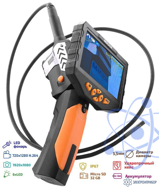 МЕГЕОН 33500-155 - новинка в модельном ряду цифровых видеоскопов, предназначенный для решения задач в быту и промышленности. Эндоскоп представляет собой устройство для исследования и осмотра скрытых от глаза полостей с возможностью сохранения видеоизображения со звуком на встроенный носитель SDHC 32Гб. Помимо этого предусмотрено получение цветных изображений с помощью фотографий.