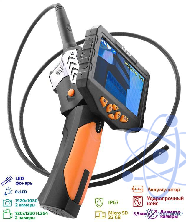 МЕГЕОН 33500-155D - новинка в модельном ряду цифровых видеоскопов, предназначенный для решения задач в быту и промышленности. Эндоскоп представляет собой устройство для исследования и осмотра скрытых от глаза полостей с возможностью сохранения видеоизображения со звуком на встроенный носитель SDHC 32Гб. Помимо этого предусмотрено получение цветных изображений с помощью фотографий.
