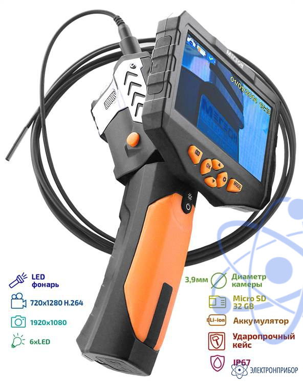 МЕГЕОН 33500-339 - новинка в модельном ряду цифровых видеоскопов, предназначенный для решения задач в быту и промышленности. Эндоскоп представляет собой устройство для исследования и осмотра скрытых от глаза полостей с возможностью сохранения видеоизображения со звуком на встроенный носитель SDHC 32Гб. Помимо этого предусмотрено получение цветных изображений с помощью фотографий.