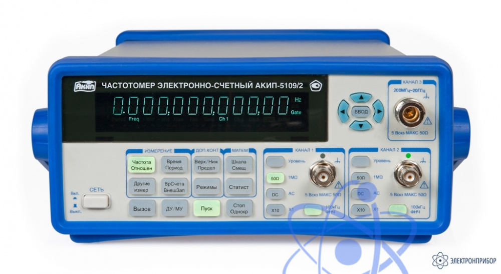 - Канал 1 и канала 2: измерение частоты, периода, временного интервала, отношения частот, фазового сдвига между сигналами, длительности и скважности, времени нарастания/ спада, счет импульсов