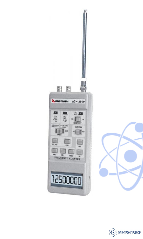 Частотомер АСН-2500: измерение частоты 10 Гц ... 2,5 ГГц; амплитуда входного сигнала 50 мВ ... 250 Вп-п; дополнительные функции: три входа (А — до 2,5 ГГц, В — до 500 МГц, С — до 10 МГц), удержание показаний, ЖКИ 8 разрядов, память, относительные измерения, измерения периода, автоотключение, возможность бесконтактного измерения через антенну; питание 4х1,5 В; габариты 173х80х35 мм; масса 340 г.
