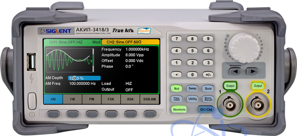 Синус, меандр, пила, треугольник, шум, произвольная (частота 1 мГц – 1 МГц) |