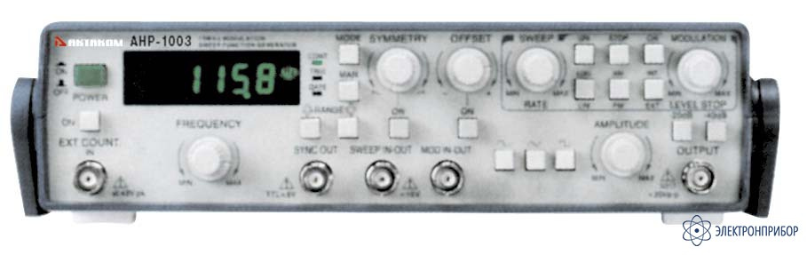 Прибор АНР-1003, предназначен для исследования, настройки и испытаний систем и приборов, используемых в радиоэлектронике, связи, автоматике, вычислительной и измерительной технике, приборостроении. Прибор обеспечивает формирование сигналов прямоугольной, треугольной, синусоидальной формы, а также импульсов ТТЛ/КМОПП уровней.