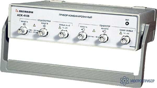 Комбинированный прибор АСК-4106 сочетает возможности осциллографа двухканального цифрового запоминающего и генератора сигналов произвольной формы двухканального цифрового. Комбинированный прибор работает совместно с компьютером по интерфейсу USB 1.1.