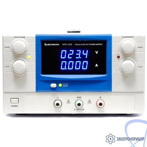 Источник питания APS-1205 имеет раздельную регулировку и индикацию тока и напряжения. Имеет ручки, как грубой, так и точной настройки тока и напряжения, что позволяет точно устанавливать выходные параметры. Благодаря такой возможности, схемотехническим решениям и двум встроенным четырехразрядным LED индикаторам разрешение установки и отображения тока составляет 0,001 А, а напряжения 0,1 В.