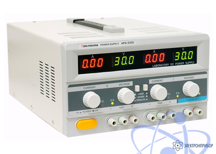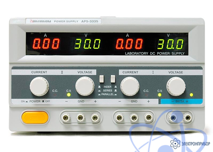 Недорогой аналоговый источник питания с цифровой индикацией APS-3335 имеет 2 регулируемых канала по 30 В, 5 А и 1 нерегулируемый канал 5 В, 3 А. Предназначен для проведения работ в процессе наладки, ремонта и лабораторных исследований. Источник питания выдает плавно регулируемое постоянное стабилизированное напряжение и стабилизированный ток.