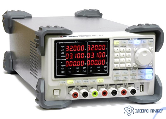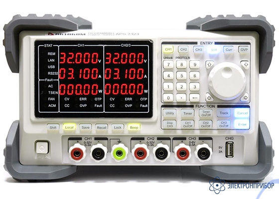 Источник питания APS-7323 предназначен для питания радиотехнических устройств стабилизированным напряжением или током. Дисплей прибора имеет максимальную разрядность 5 цифр и на нем могут одновременно отображаться значения тока, напряжения и мощности. Программирование источника питания APS-7323 может осуществляться как с передней панели, так и через интерфейсы дистанционного управления. Кроме того, на передней панели имеется отдельный USB выход для зарядки смартфонов, планшетов и прочей техники.