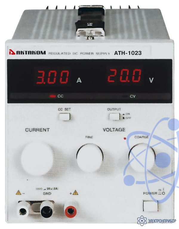 Источник постоянного напряжения АТН-1023: 0,1 … 20 В и тока 0,01 … 3 А, дополнительные функции: цифровая индикация, возможность параллельного и последовательного подключения нескольких источников, не импульсный, питание 220 В, габариты 138х162х345 мм, масса 5,9 кг.
