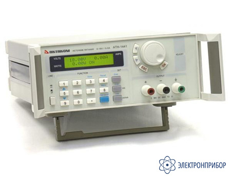 Источник постоянного напряжения АТН-1443: 0 ... 36 В и тока 0 ... 3 А, с возможностью дистанционного управления от ПК через RS-232 и USB, дополнительные функции: цифровая индикация, не импульсный, питание 220 В, габариты 212x88x250 мм, масса 5 кг.