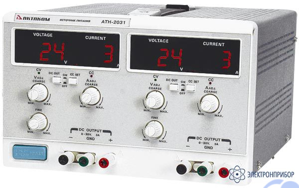 Двухканальный источник постоянного тока с цифровой индикацией АТН-2031: 0,01 А ... 3 А и напряжения 0,1 В ... 30 В, дополнительные функции: цифровая индикация, возможность последовательного подключения нескольких источников, не импульсный, питание 220 В, габариты 234х160х326 мм, масса 7,5 кг.