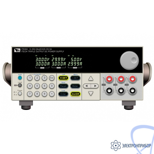 - Отображает и регулирует настройки напряжения и тока для всех трех каналов одновременно и независимо;