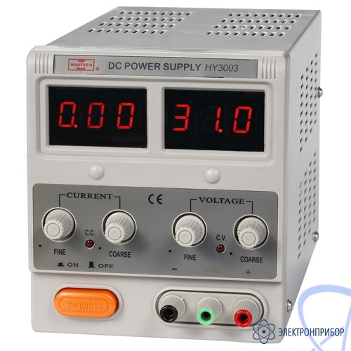 Mastech HY3003 – источник питания, позволяющий получать регулируемое, точное и стабильное постоянное напряжение или постоянный ток. Две пары регуляторов грубой и точной настройки облегчают установку напряжения и тока, а цифровые индикаторы тока и напряжения упрощают считывание параметров выхода.