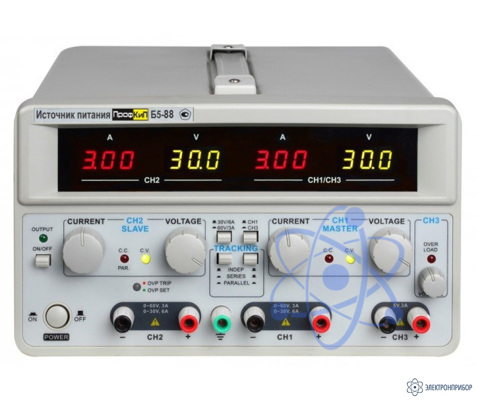 Источник питания ПрофКиП Б5-88 предназначен для питания стабилизированным напряжением и током узлов, и схем радиоэлектронной аппаратуры, при проведении работ в процессах наладки, ремонта и лабораторных исследований. Источник питания отличается от аналогичных моделей малым уровнем шумов и пульсаций выходного напряжения и тока. Прибор включен в государственный реестр средств измерений РФ и допущен к применению в сфере метрологического контроля.