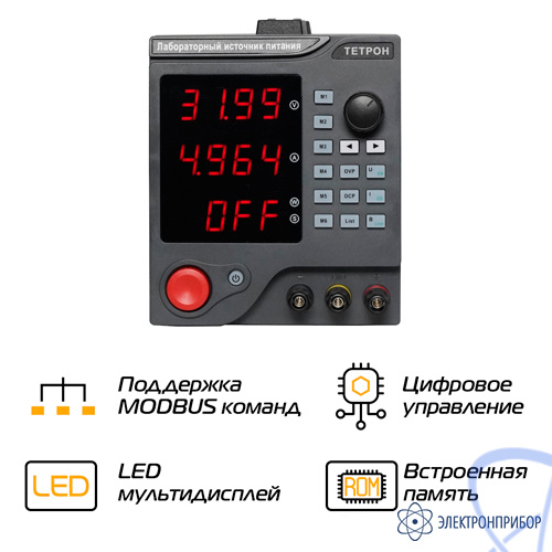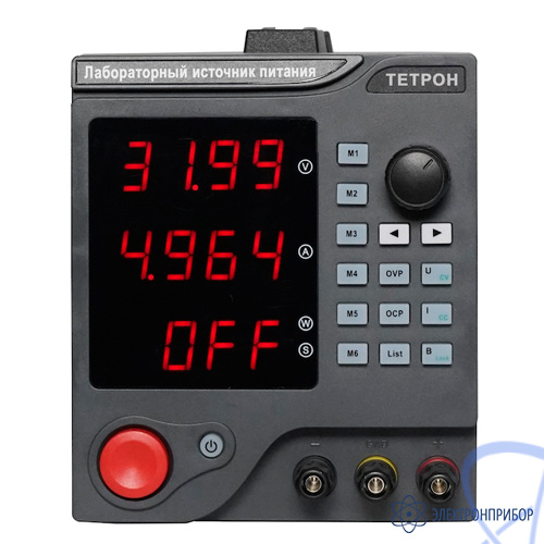 ТЕТРОН-1520ЕП является программируемым источником питания с тремя дисплеями для отображения напряжения, тока, мощности и таймера.