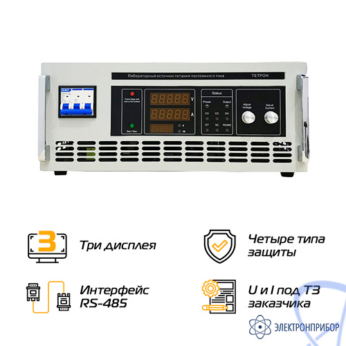 В данной модели максимальное напряжение составляет 20 вольт, максимальное значение тока 300 ампер. Встроенный интерфейс RS-485 позволяет дистанционно управлять источником.