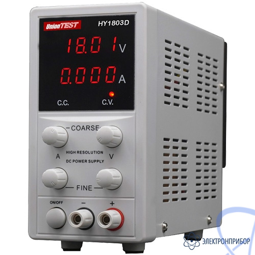 UnionTest HY1803D – источник питания, позволяющий получать регулируемое, точное и стабильное постоянное напряжение или постоянный ток. Две пары регуляторов грубой и точной настройки облегчают установку напряжения и тока, а цифровые индикаторы тока и напряжения упрощают считывание параметров выхода.