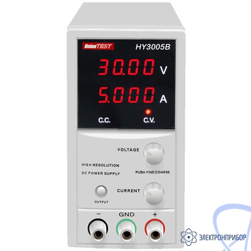 UnionTest HY3005B – импульсный источник питания, позволяющий получать регулируемое, точное и стабильное постоянное напряжение или постоянный ток. Два регулятора тока и напряжения обеспечивает точность установки, а цифровые четырёхразрядные светодиодные индикаторы тока и напряжения упрощают считывание параметров выхода. Принудительное охлаждение вентилятором повышает надёжность прибора. Модель имеет функцию электронного отключения выхода от нагрузки кнопкой, расположенной на лицевой панели.