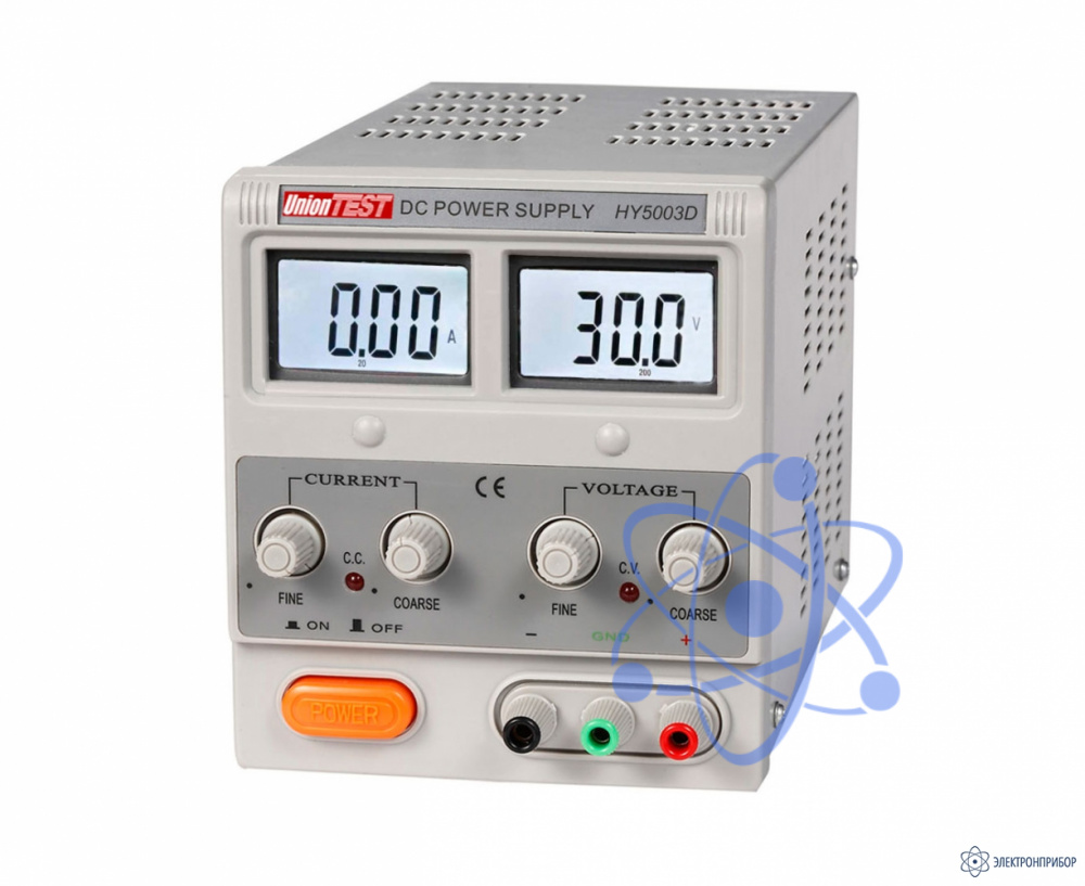 UnionTest HY5003D – источник питания, позволяющий получать регулируемое, точное и стабильное постоянное напряжение или постоянный ток. Две пары регуляторов грубой и точной настройки облегчают установку напряжения и тока, а цифровые жидкокристаллические индикаторы тока и напряжения упрощают считывание параметров выхода.